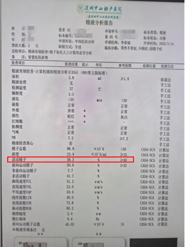 术后一周,患者遵医嘱第二次复查精液质量,结果显示:禁欲2天,精子计数近0.9亿,精子活力高达58.3%,前向运动精子比例达50.6%!